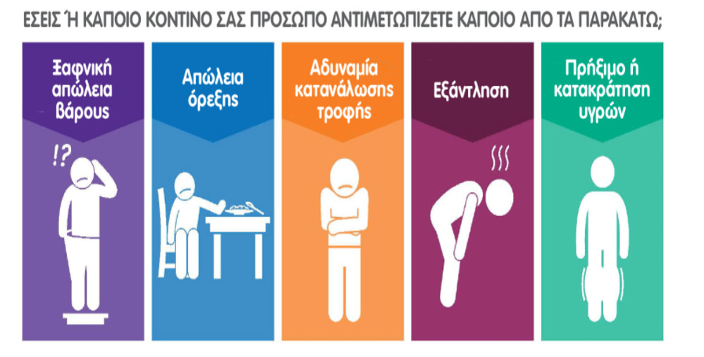 Πώς θα καταλάβουμε ότι υπάρχει κίνδυνος εμφάνισης δυσθρεψίας; Η πιο συνηθισμένη και σοβαρή ένδειξη είναι η ξαφνική απώλεια βάρους, που μπορεί να κυμαίνεται σε ποσοστό μεγαλύτερο από 5% μέσα σε ένα διάστημα 6 μηνών και από 10% σε ένα διάστημα μεγαλύτερο των 6 μηνών για ανθρώπους ηλικίας άνω των 70 ετών. Και αν το παραπάνω είναι η ένδειξη, τα συμπτώματα πέραν της απότομης απώλειας βάρους είναι και η μειωμένη όρεξη για τροφή, η εξάντληση και η γενικότερη αδυναμία και δυσκολία στην κίνηση. Σε κάθε περίπτωση, εάν παρατηρήσετε κάποιο από τα παραπάνω συμπτώματα σε εσάς ή σε κάποιον δικό σας άνθρωπο θα πρέπει να απευθυνθείτε σε έναν επαγγελματία Υγείας (γιατρό, φαρμακοποιό ή διαιτολόγο).