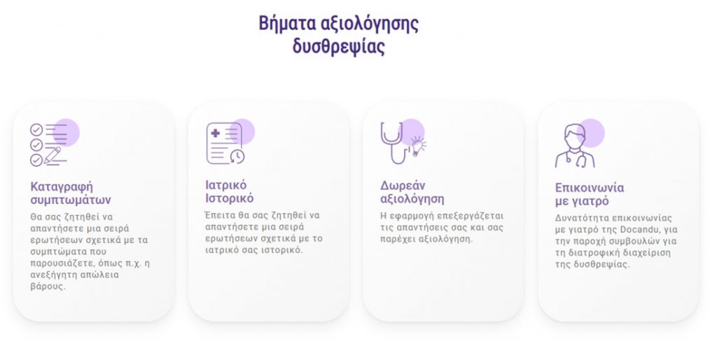 Μέχρι τότε όμως, πώς μπορείτε να ελέγξετε την πιθανότητα ύπαρξης δυσθρεψίας; Μπορείτε να κάνετε το πολύ απλό: να απαντήσετε σε ένα εύκολο και σύντομο ερωτηματολόγιο μέσω μίας έξυπνης εφαρμογής της Docandu, που θα βρείτε στο site dosevaros.gr
