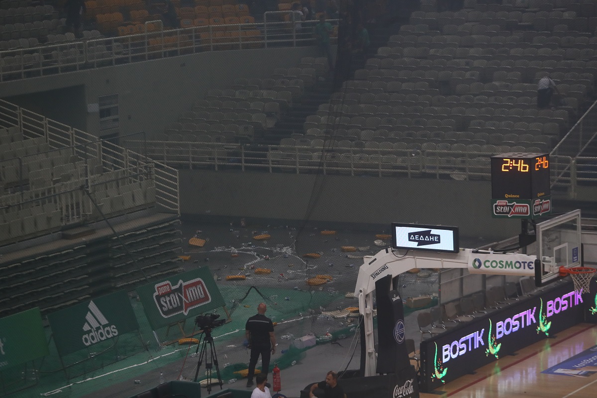 Σκηνικό… πολέμου στο ΟΑΚΑ: Σπασμένα καθίσματα και σύννεφο καπνού στο κλειστό (pics)