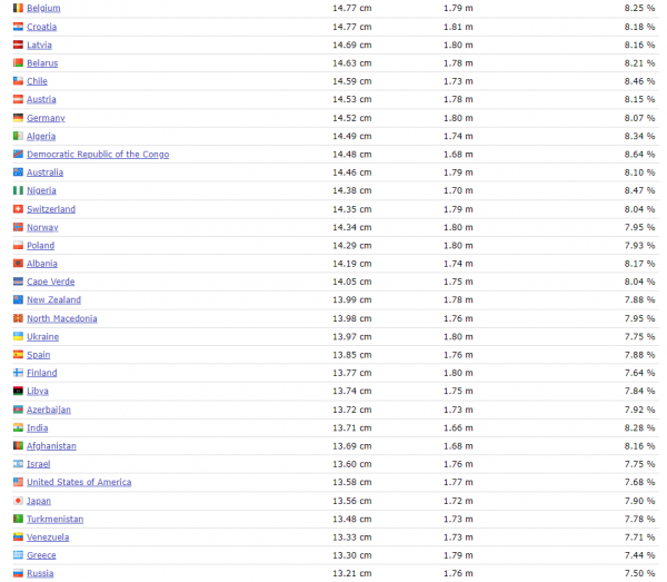 Χαμηλά στη λίστα είναι επίσης η Κίνα με 13,07 εκατοστά, η Τουρκία με 12,99 εκατοστά, η Ιρλανδία με 12,78 εκατοστά και η Ρουμανία με 12,73 εκατοστά.