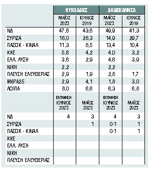 Και στις Κυκλάδες, αλλά και στα Δωδεκάνησα η κάλπη της ενισχυμένης αναλογικής αναμένεται να φέρει σημαντικές αλλαγές προς όφελος της Νέας Δημοκρατίας, χάρη στην εξαιρετική της επίδοση (καλύτερο πανελλαδικό ποσοστό του κόμματος στα Δωδεκάνησα και 4ο καλύτερο στις Κυκλάδες), περιορίζοντας στη 1 έδρα (ή το μέγιστο 2) την εκπροσώπηση της αντιπολίτευσης, ενώ κάποια λιγότερο πιθανά σενάρια δίνουν στη Νέα Δημοκρατία και τις 9 έδρες της Περιφέρειας Νοτίου Αιγαίου.