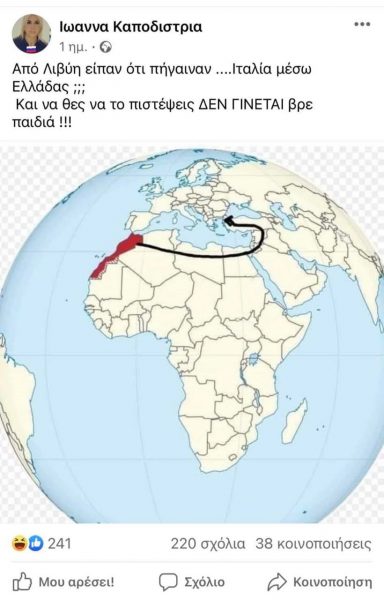 «Από Λιβύη είπαν ότι πήγαιναν… Ιταλία μέσω Ελλάδας;;; Και να θες να το πιστέψεις ΔΕΝ ΓΙΝΕΤΑΙ βρε παιδιά!!!», λέει η… καπετάνισσα, δείχνοντας και μία διαδρομή στον χάρτη, που ξεκινάει από το Μαρόκο και φτάνει ή… στην Χαλκιδική ή στην Κωνσταντινούπολη!