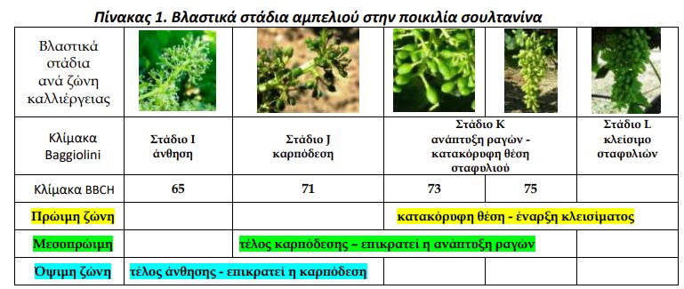 Στον πίνακα 1 δίνεται η εξέλιξη των βλαστικών σταδίων στην ποικιλία σουλτανίνα.
