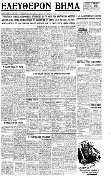 «ΕΛΕΥΘΕΡΟΝ ΒΗΜΑ», 26.2.1943, Ιστορικό Αρχείο «ΤΟ ΒΗΜΑ» & «ΤΑ ΝΕΑ»