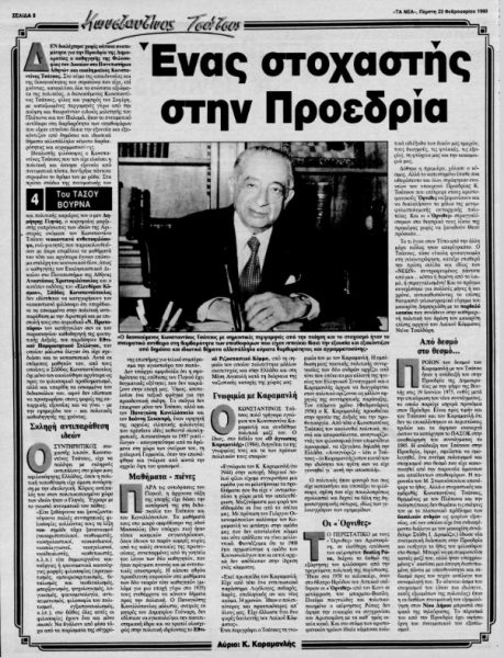 Το κείμενο του Βουρνά, που έφερε τον τίτλο «Ένας στοχαστής στην Προεδρία», είχε δημοσιευτεί στην εφημερίδα «Τα Νέα» στις 22 Φεβρουαρίου 1990.