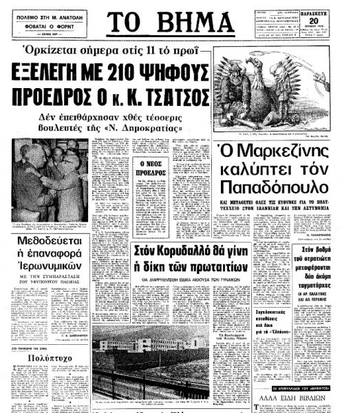 Δεν διαλέχτηκε χωρίς κάποια σκοπιμότητα για την Προεδρία της Δημοκρατίας ο καθηγητής της Φιλοσοφίας του Δικαίου στο Πανεπιστήμιο Αθηνών και ακαδημαϊκός Κωνσταντίνος Τσάτσος. Στο κύμα της απαιδευσίας και της βαναυσότητας του στρατώνα που είχε, επί χούντας, κατακλύσει όλα τα ανώτατα αξιώματα της πολιτείας, ο διανοούμενος Κωνσταντίνος Τσάτσος, φίλος και γαμπρός του Σεφέρη, με καταξιωμένες περγαμηνές γύρω από την ποίηση και ειδικός μελετητής του Πλάτωνα και του Παλαμά, ήταν το πνευματικό αντίβαρο στη βαρβαρότητα των σπαθοφόρων που είχαν ιππεύσει βίαια την εξουσία και εξακόντιζαν από δημόσια και ιδιωτικά βήματα αλλεπάλληλα κύματα βαρβαρότητας και αγραμματοσύνης.