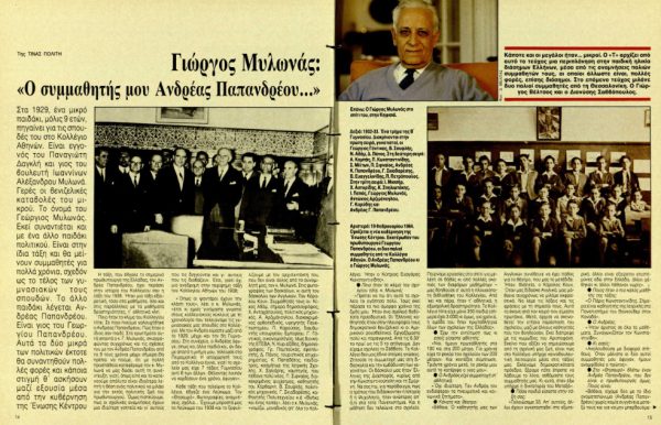 Οι αναμνήσεις του νομικού και πολιτικού Γεωργίου Μυλωνά (1919-1998) για το Κολλέγιο Αθηνών, την τάξη του 1938 και τον τότε πρωθυπουργό της χώρας, Ανδρέα Παπανδρέου, είχαν δημοσιευτεί στο τεύχος του «Ταχυδρόμου» που είχε κυκλοφορήσει στις 30 Απριλίου 1987. Ο Μυλωνάς είχε παραχωρήσει την ανωτέρω συνέντευξη στη δημοσιογράφο Τίνα Πολίτη (1945-2000).