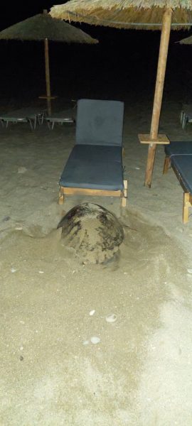 Επί πέντε ώρες, όπως αναφέρει κάτοικος της περιοχής, η χελώνα προσπαθούσε να βρει έναν χώρο αλλά μάταια. Το μεγαλύτερο μέρος της παραλίας είναι καλυμμένο με ξαπλώστρες και ήταν αδύνατο να γεννήσει.