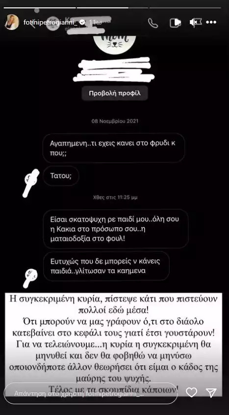 Μήνυση ετοιμάζεται να καταθέσει η Φωτεινή Πετρογιάννη εναντίον ενός λογαριασμού στα social media που της έγραψε άσχημα και προσβλητικά σχόλια.