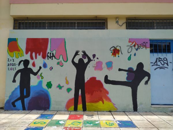 Είμαι αναπληρώτρια εικαστικός σε δημοτικό σχολείο στην Θεσσαλονίκη (Πολίχνη). Τους τελευταίους δύο μήνες τα παιδιά των μεγάλων τάξεων ζωγραφίζουν τους τοίχους του σχολείου τους. Ειδικά τα παιδιά της έκτης αποφάσισαν τι θέλουν να ζωγραφίσουν και το έκαναν χωρίς σχεδόν καθόλου βοήθεια από μένα. Ήταν ενθουσιασμένα που θα άφηναν κάτι στο σχολείο τους για να τους θυμούνται.