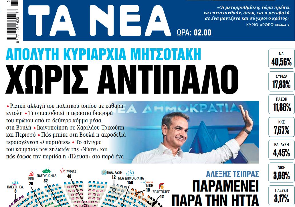 Απόλυτη κυριαρχία Μητσοτάκη Χωρίς αντίπαλο •Ριζική αλλαγή του πολιτικού τοπίου με καθαρή εντολή •Τι σηματοδοτεί η τεράστια διαφορά του πρώτου από το δεύτερο κόμμα μέσα στη Βουλή •Ικανοποίηση σε Χαριλάου Τρικούπη και Περισσό •Πώς μπήκε στη Βουλή η ακροδεξιά τερατογένεση «Σπαρτιάτες» •Το αίνιγμα του κόμματος των ζηλωτών της «Νίκης» και πώς έσωσε την παρτίδα η «Πλεύση» στο παρά ένα