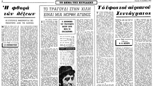 *Άρθρο του αμερικανού δημοσιογράφου και ειρηνιστή Colman McCarthy για τη Χιλή της δεκαετίας του ’60 και του ’70, για το χιλιανό πρόεδρο Σαλβαδόρ Αλιέντε και το χιλιανό μουσικό Βίκτορ Χάρα. Το ενδιαφέρον κείμενο του McCarthy, που έφερε τον τίτλο «Το τραγούδι στην Χιλή είναι μια μορφή αγώνος», είχε δημοσιευτεί στην εφημερίδα The Washington Post και στο «Βήμα» (στην ελληνική εφημερίδα, την Κυριακή 10 Νοεμβρίου 1974).