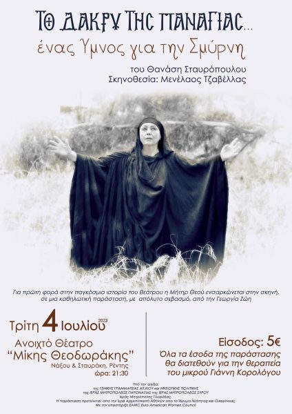 «Το Δάκρυ της Παναγίας… Ένας Ύμνος για την Σμύρνη» του Θανάση Σταυρόπουλου σε σκηνοθεσία Μενέλαου Τζαβέλλα ανεβαίνει στο Ανοιχτό Θέατρο «Μίκης Θεοδωράκης» (Νάξου και Σταυράκη) την Τρίτη 4 Ιουλίου στις 9.30 μ.μ.