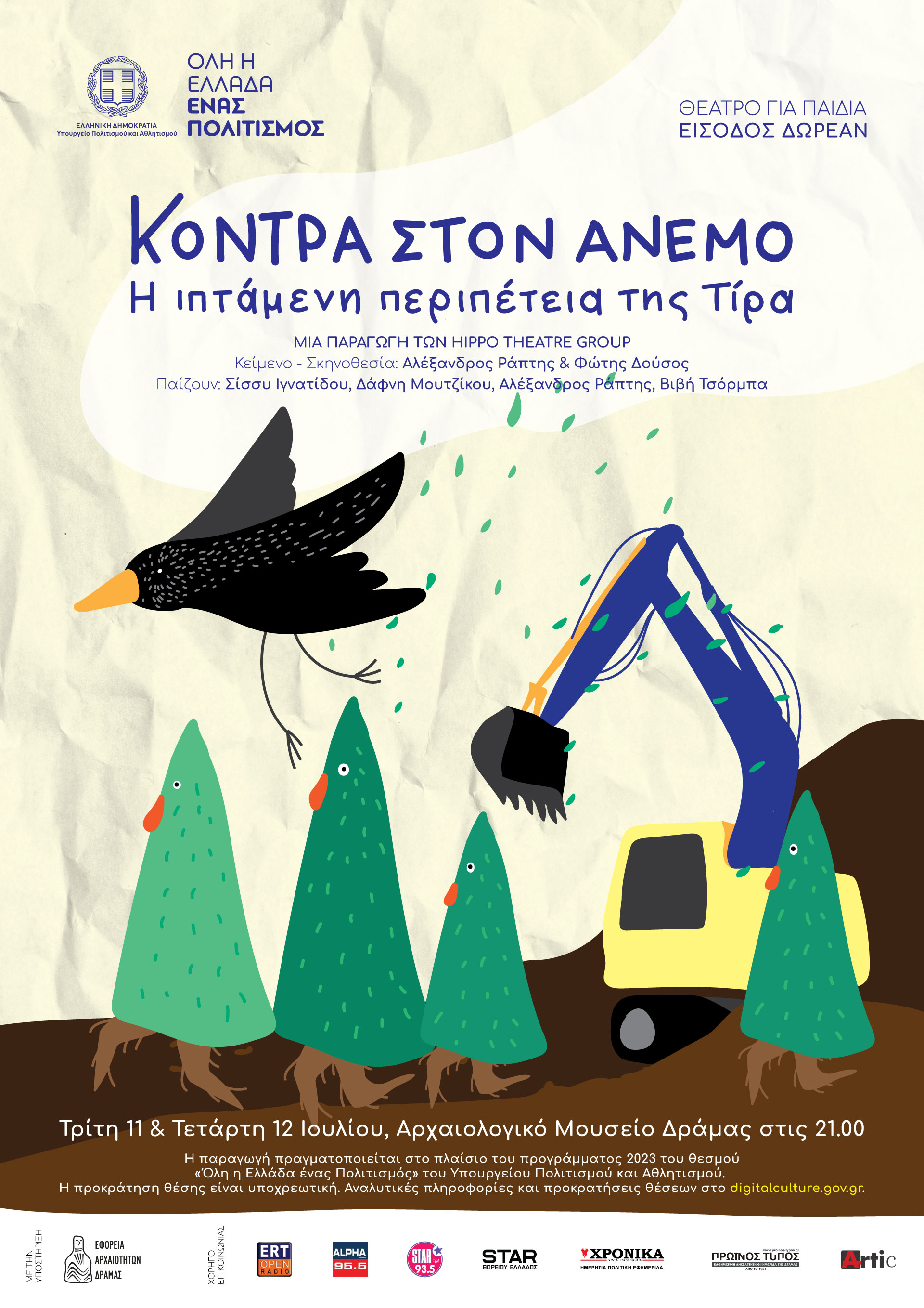 Η θεατρική ομάδα Hippo Theatre Group παρουσιάζει την διαδραστική παράσταση για παιδιά με τίτλο «Κόντρα στον Άνεμο: η ιπτάμενη περιπέτεια της Τίρα» στο Αρχαιολογικό Μουσείο Δράμας την Τρίτη 11 και την Τετάρτη 12 Ιουλίου 2023.