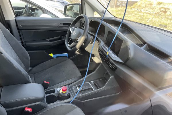 Η θύρα φόρτισης στο μπροστινό τμήμα, πίσω από το φτερό δεν αφήνει περιθώρια αμφιβολίας για το είδος του συνόλου που παρεπιδημεί στην αθέατη πλευρά του Caddy.