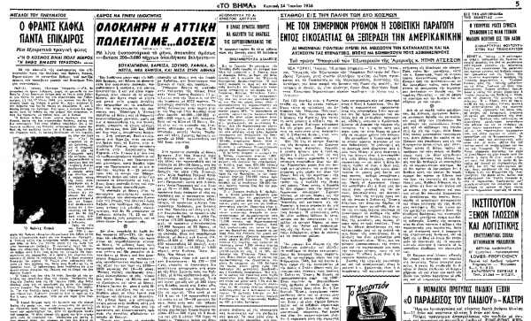 *Άρθρο για έναν από τους μεγάλους του πνεύματος, που έφερε τον τίτλο «Ο Φραντς Κάφκα πάντα επίκαιρος» και είχε δημοσιευτεί στην εφημερίδα «Το Βήμα» την Κυριακή 24 Ιουνίου 1956.