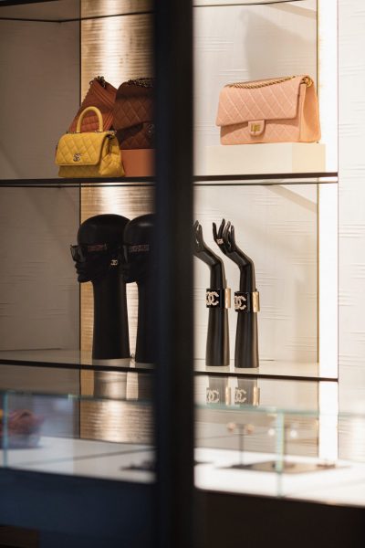 Κατά την είσοδο στη boutique, συναντάμε έναν ενιαίο χώρο αφιερωμένο στον κόσμο των αξεσουάρ της Chanel με μια επιλογή από iconic τσάντες και τσάντες της νέας σεζόν, οι οποίες παρουσιάζονται με ελκυστικό τρόπο, μαζί με μια συλλογή κλασσικών ρολογιών, όπως το Première, το J12 και το Boyfriend, εκλεκτών κοσμημάτων όπως τα Coco Crush και τα Camélia, αλλά και οπτικών ειδών.