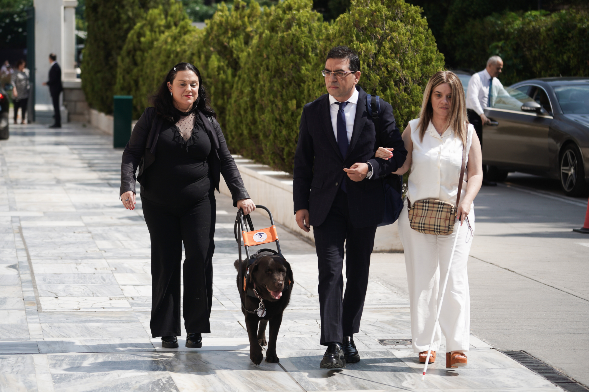 Μάλιστα η μία κυρία συνοδευόταν από τον σκύλο-οδηγό της, ίσως πιθανότατα στην πρώτη φορά που σκύλος-οδηγός βρέθηκε στο ελληνικό Κοινοβούλιο.
