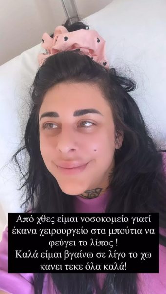 «Από χθες είμαι νοσοκομείο γιατί έκανα χειρουργείο στα μπούτια να φύγει το λίπος. Καλά είμαι, βγαίνω σε λίγο, το έχω κάνει τεκέ, όλα καλά», έγραψε χαρακτηριστικά στην ανάρτησή της χωρίς να δώσει περισσότερες λεπτομέρειες