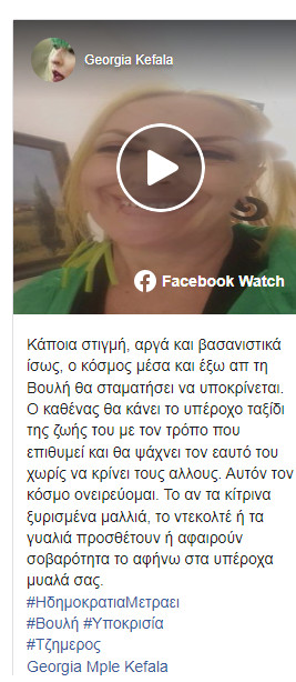 Από το να κάνει πατίνια 17 χρονών έξω από τη Βουλή, χωρίς κανέναν θείο στην Κορώνη, καταφέρνει να μπει μέσα στη Βουλή και να λέει τη γνώμη του. Αυτό είναι το εξαιρετικό με τη Δημοκρατία και εκεί θα πρέπει να σταθούμε. Σας ευχαριστώ όλους», αναφέρει στο βίντεό της η Τζώρτζια Κεφαλά.