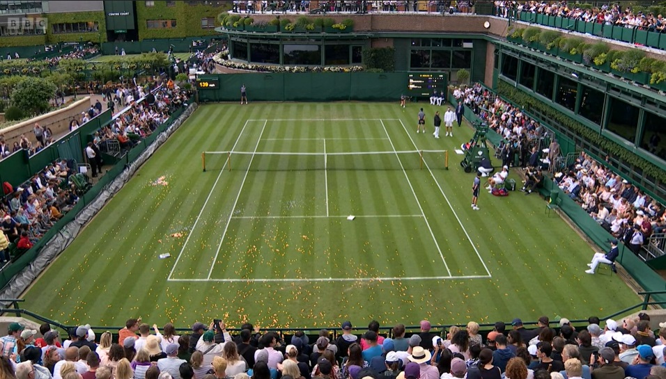 Just stop oil sitting protest on court 18 as Grigor Dimitrov plays Sho Shimabukuro. Two protestors burst onto court with orange confetti. #WIMBLEDONpic.twitter.com/33ogjUhSre