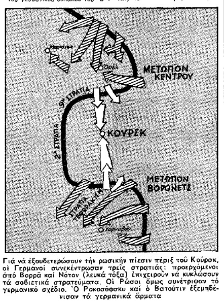 Η «Επιχείρησις Φρούριον» (σ.σ. η Επιχείρηση CITADEL προέβλεπε την από κοινού επίθεση της Ομάδας Στρατιών Κέντρου και της Ομάδας Στρατιών Νότου κατά της εξέχουσας του Κουρσκ) εξαπελύθη την 5ην Ιουλίου 1943. Δύο γερμανικαί θωρακισμέναι στρατιαί, η 9η και η 4η, εξώρμησαν η μία κατά του βορείου και η άλλη κατά του νοτίου σημείου της βάσεως της ρωσικής προεξοχής, με αντικειμενικόν σκοπόν να συναντηθούν. Διά την προσπάθειαν αυτήν είχε συγκεντρωθή ό,τι στερεώτερον διέθετεν η Βέρμαχτ και προ παντός τα τελευταίου τύπου και προσφάτου κατασκευής τανκς –ένα τέρας 68 τόννων που είχε βαπτισθή «Φερδινάνδος»– και 90 από τα εξαίρετα άρματα «Τίγρις», τύπου που είχε σχεδιασθή από τον μανιακόν Πόρσε και είχε κατασκευασθή από τον Κρουπ. Το έδαφος ήταν στερεόν και ιδεώδες δι’ αρματομαχίαν. Η ζέστη πολλή, αλλά χωρίς να είναι αποπνικτική. Άνεμος αισιοδοξίας έπνεεν εις τας γερμανικάς τάξεις. Ο Χίτλερ είχε διστάσει αρχικώς να συγκατατεθή εις την επιχείρησιν, την οποίαν υπεδείκνυεν ο Μανστάιν. Έπειτα, αποτόμως, ήρχισε να ονειρεύεται ένα θαύμα. Υπεστήριζεν ότι μετά τας απωλείας που είχεν υποστή –4 εκατομμύρια αιχμάλωτοι και 9 εκατομμύρια νεκροί– η Ρωσία εστέκετο ορθή μόνον χάρις εις ένα απεγνωσμένον φανατισμόν. Ποιος ξέρει εάν η επίθεσις του Κουρσκ δεν θα ήταν το μοιραίον κτύπημα που θα κατέλυε μίαν ασταθή ισορροπίαν; Η έκβασις των πολέμων αποφασίζεται κατά το τελευταίον τέταρτον. Ίσως το τέταρτον αυτό να προσήγγιζε…