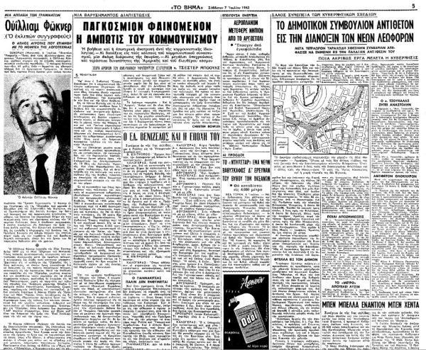 Ένας από τους αξιολογωτέρους συγχρόνους Αμερικανούς συγγραφείς, ο Ουίλλιαμ Φώκνερ, απέθανε σήμερον (σ.σ. 6 Ιουλίου η ημερομηνία της ανταπόκρισης από την Οξφόρδη της πολιτείας του Μισισιπή) εις το ενταύθα νοσοκομείον, συνεπεία καρδιακής προσβολής. Ο πρόωρος θάνατός του –ήτο 64 μόλις ετών– θεωρείται ως οδυνηρόν πλήγμα διά τα αμερικανικά γράμματα, τα οποία προ ενός περίπου έτους έχασαν μίαν ακόμη προσωπικότητα, τον Έρνεστ Χεμινγουαίη. Ο Φώκνερ είχεν επιστρέψει εις την Οξφόρδην προ μερικών εβδομάδων από την Σάρλοτσβιλ της Βιρτζίνια, εις το Πανεπιστήμιον της οποίας διετήρει την θέσιν του λέκτορος επί της αμερικανικής φιλολογίας. Η είδησις του θανάτου του επροκάλεσε θλίψιν εις τους πνευματικούς όσον και ευρυτέρους κύκλους των Ηνωμένων Πολιτειών, όπου ο αποθανών συγγραφεύς, ο οποίος παρέμεινεν εις ολόκληρον την ζωήν του ένας απλός αγρότης, ήτο εξαιρετικά αγαπητός. Ευθύς ως εγνώσθη η πληροφορία του θανάτου του, ο Πρόεδρος Κέννεντυ εις ειδικήν δήλωσίν του απέτισε φόρον τιμής εις τον τιμηθέντα διά του Βραβείου Νομπέλ συγγραφέα, ειπών ότι «το έργον του θα παραμείνη άφθαρτον από τον χρόνον».
