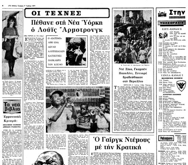 Σε ηλικία 71 ετών (τα έκλεισε την Κυριακή), ο Λούις Άρμστρονγκ, ο «σακουλοστόμης» («Σάτσμο») με τα ευκίνητα γουρλωτά μάτια, ο πάλαι ποτέ αλητάκος που έμαθε να παίζη τρομπέττα σ’ ένα σχολειό της Λουιζιάνας για να κατακτήση τις καρδιές εκατομμυρίων ανθρώπων σ’ όλο τον κόσμο, δεν υπάρχει πια. Πέθανε σήμερα (σ.σ. 6 Ιουλίου η ημερομηνία της ανταπόκρισης από τη Νέα Υόρκη) ύστερα από παραμονή 10 εβδομάδων στο νοσοκομείο «Μπετ Ισραήλ».