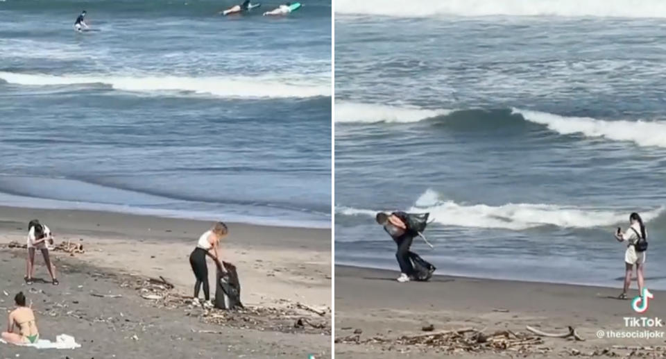 Με τίτλο «πώς να φροντίζετε το περιβάλλον», το κλιπ – το οποίο έχει ήδη συγκεντρώσει περισσότερες από 1,4 εκατομμύρια προβολές στο TikTok μετά την ανάρτησή του την Πέμπτη – δείχνει μια νεαρή να τοποθετεί αντικείμενα σε μαύρες σακούλες σκουπιδιών σε μια άγνωστη παραλία, ενώ μια άλλη γυναίκα σκύβει μπροστά της για να την τραβήξει βίντεο.