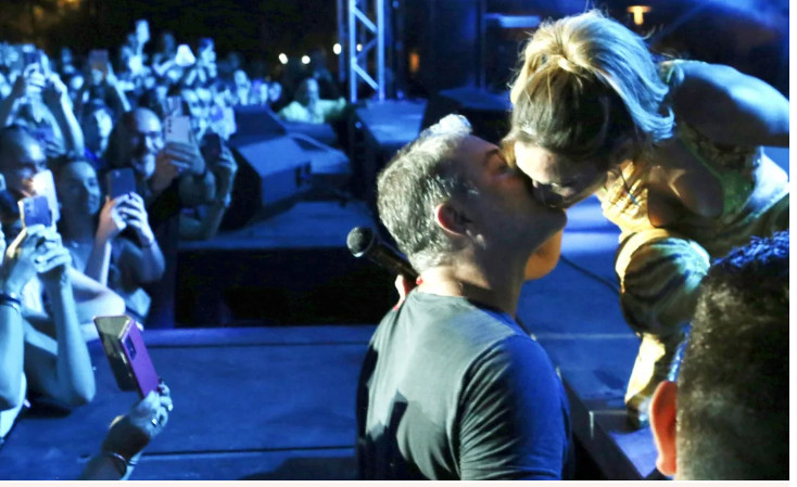 Μάλιστα, όταν ολοκλήρωσε την ερμηνεία ενός τραγουδιού έσπευσε να τον χαιρετήσει και να τον καλωσορίσει με τον πιο τρυφερό τρόπο. Γονάτισε, έσκυψε και τον φίλησε τρυφερά ενώ είπε από μικροφώνου «Γεια σου μωρό μου», δείχνοντας να χαίρεται πολύ με την παρουσία του κοντά της.