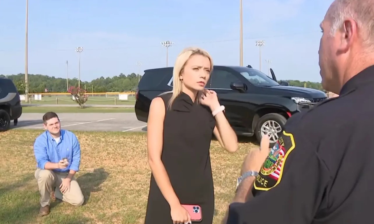 Όσο εκείνη άκουγε με προσοχή τον αστυνομικό, από πίσω της βρισκόταν ο αγαπημένος της, ο πυροσβέστης Μπλέικ Μπιόρνσον, με ένα κουτί που περιείχε το μονόπετρο δαχτυλίδι. Γονατιστός της ζήτησε να τον παντρευτεί κι η ρεπόρτερ δίχως κανέναν δισταγμό του είπε το πολυπόθητο «ναι» κάνοντας τους παρευρισκόμενους να ξεσπάσουν σε χειροκροτήματα.