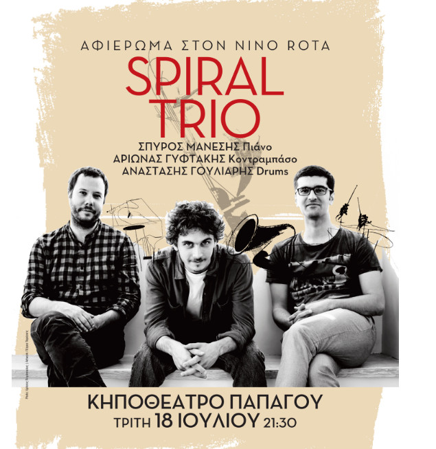 Το Spiral Trio έρχεται την Τρίτη 18 Ιουλίου στο Κηποθέατρο Παπάγου για να μας ταξιδέψει στις ξεχωριστές μελωδίες του μεγάλου Ιταλού συνθέτη Nino Rota. Οι βιρτουόζοι Σπύρος Μάνεσης (πιάνο), Αρίωνας Γυφτάκης (κοντραμπάσο) και Αναστάσης Γούλιαρης (τύμπανα) ετοιμάζουν για όλους εμάς μια κατανυκτική jazz βραδιά, κατά την οποία θα συνομιλήσουν μουσικά με αγαπημένες συνθέσεις που έχουν αφήσει το στίγμα τους στις ταινίες του Fellini και του Visconti, όπως και στις δύο πρώτες ταινίες της τριλογίας του Coppola «Ο Νονός» -και όχι μόνο-, τις οποίες έχουν διασκευάσει με πολλή τόλμη, φαντασία αλλά και σεβασμό.