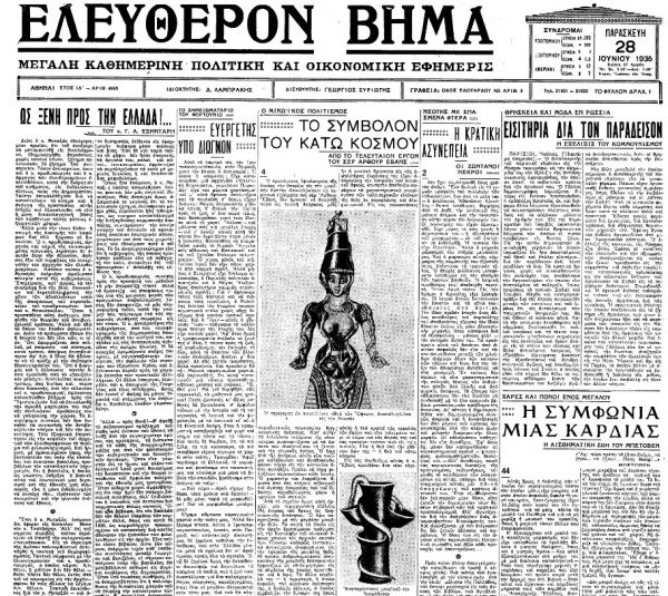 *Άρθρο για τη Θεά των Όφεων, το μινωικό πολιτισμό και τον περίφημο βρετανό αρχαιολόγο Άρθουρ Έβανς. Έφερε τον τίτλο «Το σύμβολον του Κάτω Κόσμου» και είχε δημοσιευτεί στην εφημερίδα «Ελεύθερον Βήμα» στις 28 Ιουνίου 1935.