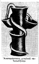 Εν τούτοις τα άλλα σύμβολα με τα οποία συνδέεται η λατρεία ακόμη και εις τα πρωτόγονα εκείνα ιερά δείχνουν ότι πρόκειται ήδη περί της ιδίας μινωικής θεάς την οποίαν απαντώμεν εις υψηλοτέρας θρησκευτικάς σφαίρας. Η εμφάνισις των ιερών περιστερών αποκαλύπτει ήδη την αρχήν μιας νέας φάσεως της θρησκευτικής εξελίξεως. Το κατ’ εξοχήν χαρακτηριστικόν της παλαιάς οφιολατρείας –ο περίεργος «φιδοσωλήν»– υφίσταται την πιο απίθανον μετατροπήν. Γίνεται… περιστερεών. Και υπό την νέαν αυτήν μορφήν του ανευρίσκεται εις την Κύπρον, όπου χρησιμεύει ως σκεύος λατρείας της θεάς υπό την μορφήν της Αφροδίτης. Ο αρχικός σωλήν αλλάζει σχήμα. Αντί των αρχικών δοχείων προς διατροφήν των όφεων αποκτά οπάς διά την είσοδον και την έξοδον του πτηνού-συμβόλου της θεάς. Έτσι ένα τεμάχιον μινωικού υδροσωλήνος –πρόσκαιρον καταφύγιον του κοινού φιδιού– μετεμορφώθη σιγά-σιγά εις ομοίωμα φωλεάς περιστερών αφιερωμένων εις μίαν ουρανίαν θεότητα.