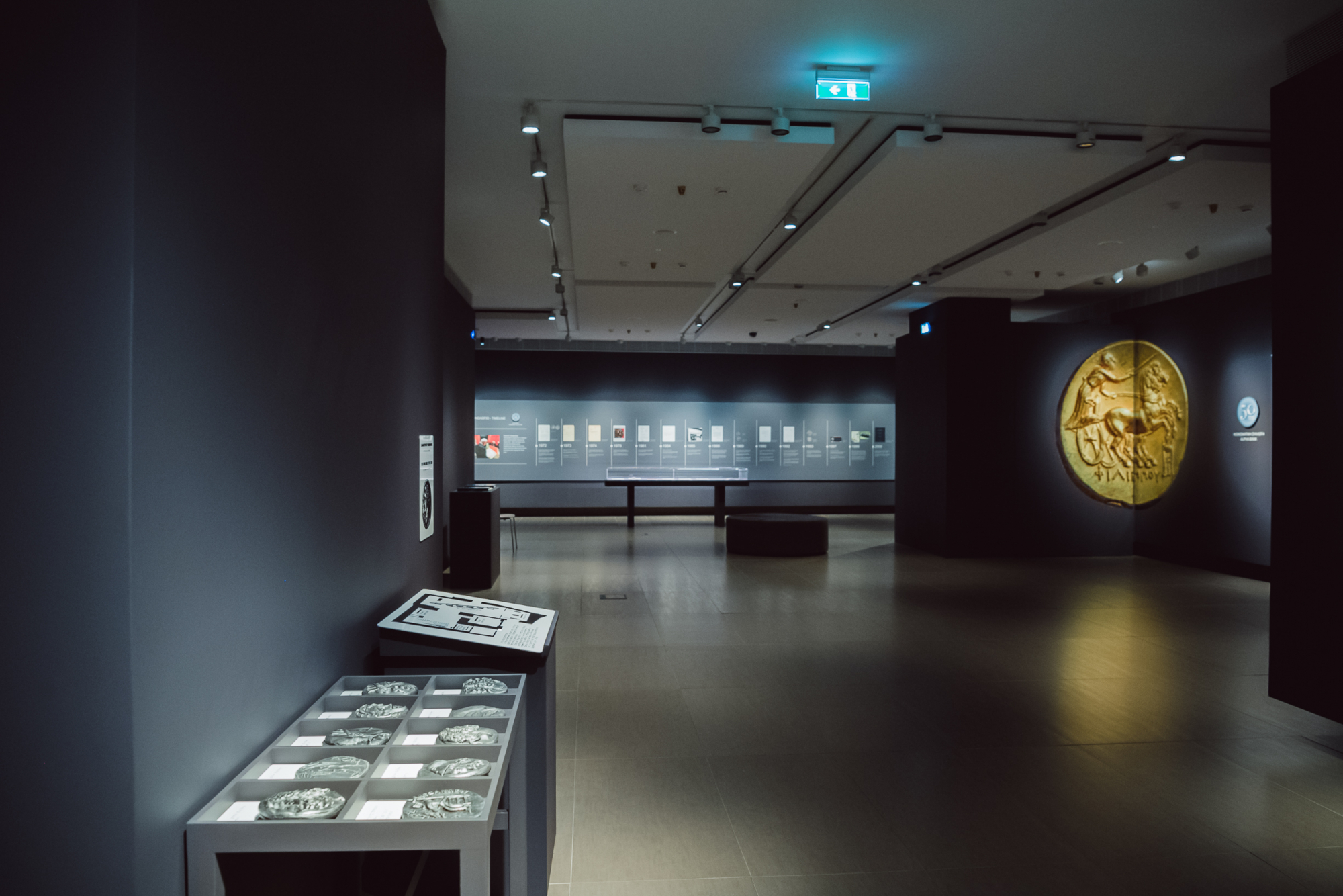 Φθάνοντας στον εκθεσιακό χώρο, μας υποδέχονται η όμορφη νύμφη Αρέθουσα, από το δεκάδραχμο των Συρακουσών, το αποκορύφωμα της νομισματικής τέχνης, και το νικηφόρο άρμα με τα καλπάζοντα άλογα του βασιλιά Φιλίππου Β΄, που του χάρισαν τον τίτλο του Ολυμπιονίκη, το 352 ή το 348 π.Χ. Ακολουθούν τα ίδια τα εκθέματα, 150 πρόσωπα και ιστορίες από τη Σφαίρα του Μύθου και τον Ρου της Ιστορίας, εικόνες μοναδικές τις οποίες μπορούν να απολαύσουν όλοι ανεξαιρέτως!