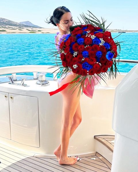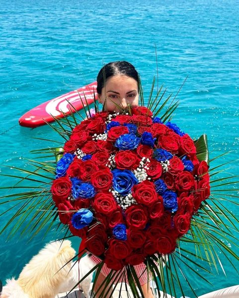 Σε άλλο στιγμιότυπο κρατά μία μεγάλη ανθοδέσμη από κόκκινα και μπλε τριαντάφυλλα και κοιτά χαμογελαστή τον φακό.