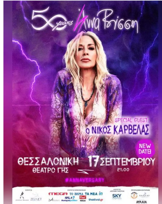 Η αρχική προγραμματισμένη συναυλία της τραγουδίστριας στη συμπρωτεύουσα αναβλήθηκε για σοβαρούς τεχνικούς λόγους και η νέα ημερομηνία όπως ανακοίνωσε το επίσημο fan club της τραγουδίστριας, η Άννα Βίσση πρόκειται να δώσει την επετειακή της συναυλία στο Θέατρο Γης στη Θεσσαλονίκη την Κυριακή 17 Σεπτεμβρίου στις 21:00, με τα ήδη αγορασμένα εισιτήρια να ισχύουν κανονικά.