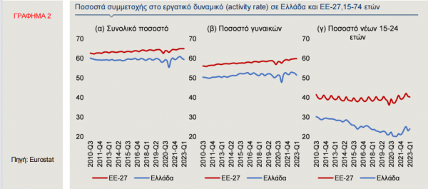 Η σημαντική υστέρηση της χώρας μας έναντι του ευρωπαϊκού μέσου όρου στο ποσοστό συμμετοχής στο εργατικό δυναμικό υποδηλώνει ότι υπάρχουν σημαντικά περιθώρια αύξησής του, ιδιαίτερα στις γυναίκες και στους νέους.