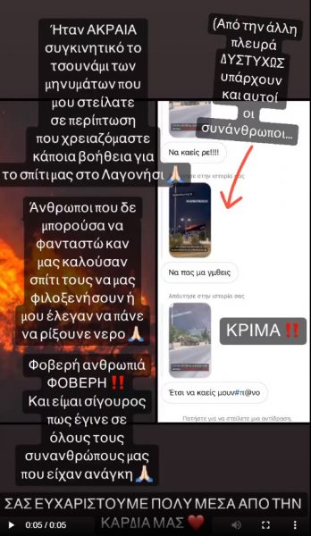«Ήταν ακραία συγκινητικό το τσουνάμι των μηνυμάτων που μου στείλατε σε περίπτωση που χρειαζόμαστε βοήθεια για το σπίτι μας στο Λαγονήσι. Άνθρωποι που δεν μπορούσα να φανταστώ καν μας καλούσαν σπίτι τους να μνας φιλοξενήσουν μου έλεγαν να πάνε να ρίξουν νερό. Φοβερή ανθρωπιά. ΦΟΒΕΡΗ. Και είμαι σίγουρος πως έγινε σε όλους τους συνανθρώπους μας που έχουν ανάγκη. Σας ευχαριστούμε πολύ μέσα από την καρδιά μας» έγραψε ο Γρηγόρης Γκουντάρας.