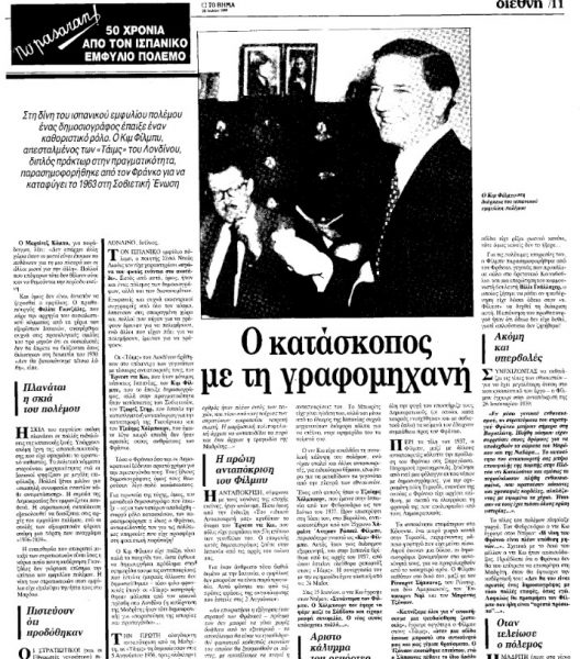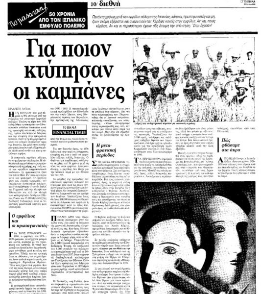 Τον Ιούλιο του 1986, με την αφορμή της συμπλήρωσης μισού αιώνα από την έναρξη του Ισπανικού Εμφυλίου, δημοσιεύτηκε στην εφημερίδα «Το Βήμα» (και στους Financial Times) ένα άρθρο αναφορικά με τον Ισπανικό Εμφύλιο, που έφερε τον τίτλο «Για ποιον κτύπησαν οι καμπάνες». Στο κείμενο αυτό, το οποίο είχε συμπεριληφθεί στο φύλλο του «Βήματος» που είχε κυκλοφορήσει στις 20 Ιουλίου 1986, διαβάζουμε τα εξής: