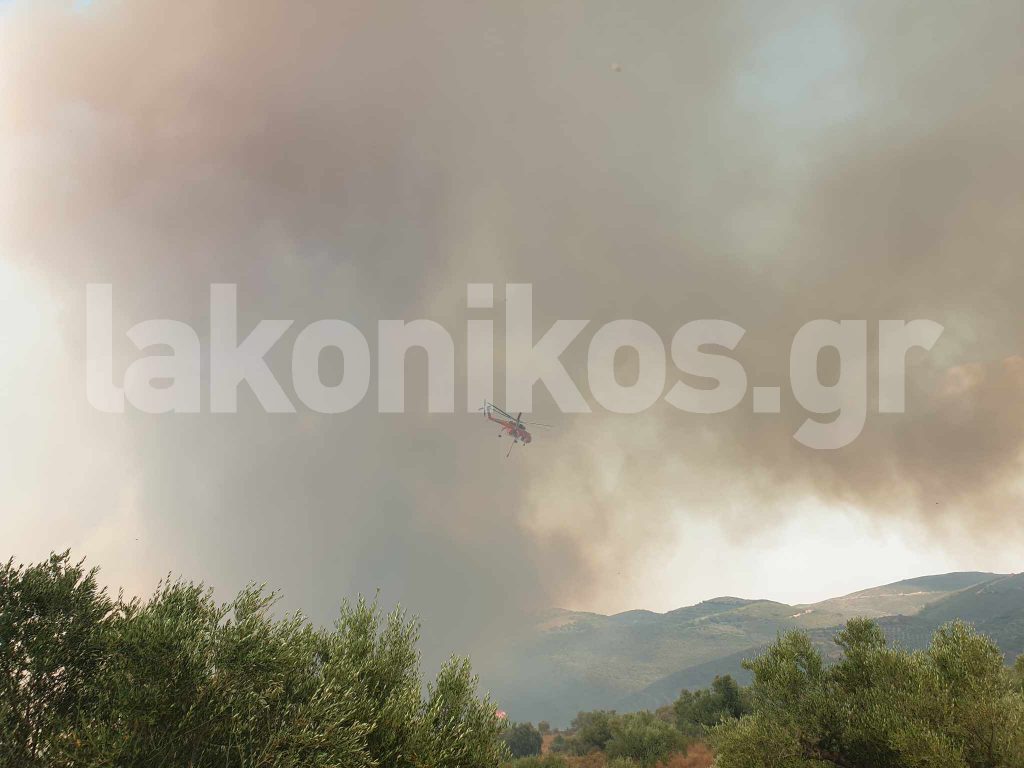 Οι άνεμοι είναι ισχυροί και κατευθύνουν την πυρκαγιά μακριά από κατοικημένη περιοχή -καθώς σε κοντινή απόσταση βρίσκεται το χωριό Δαφνί του δήμου Ευρώτα.