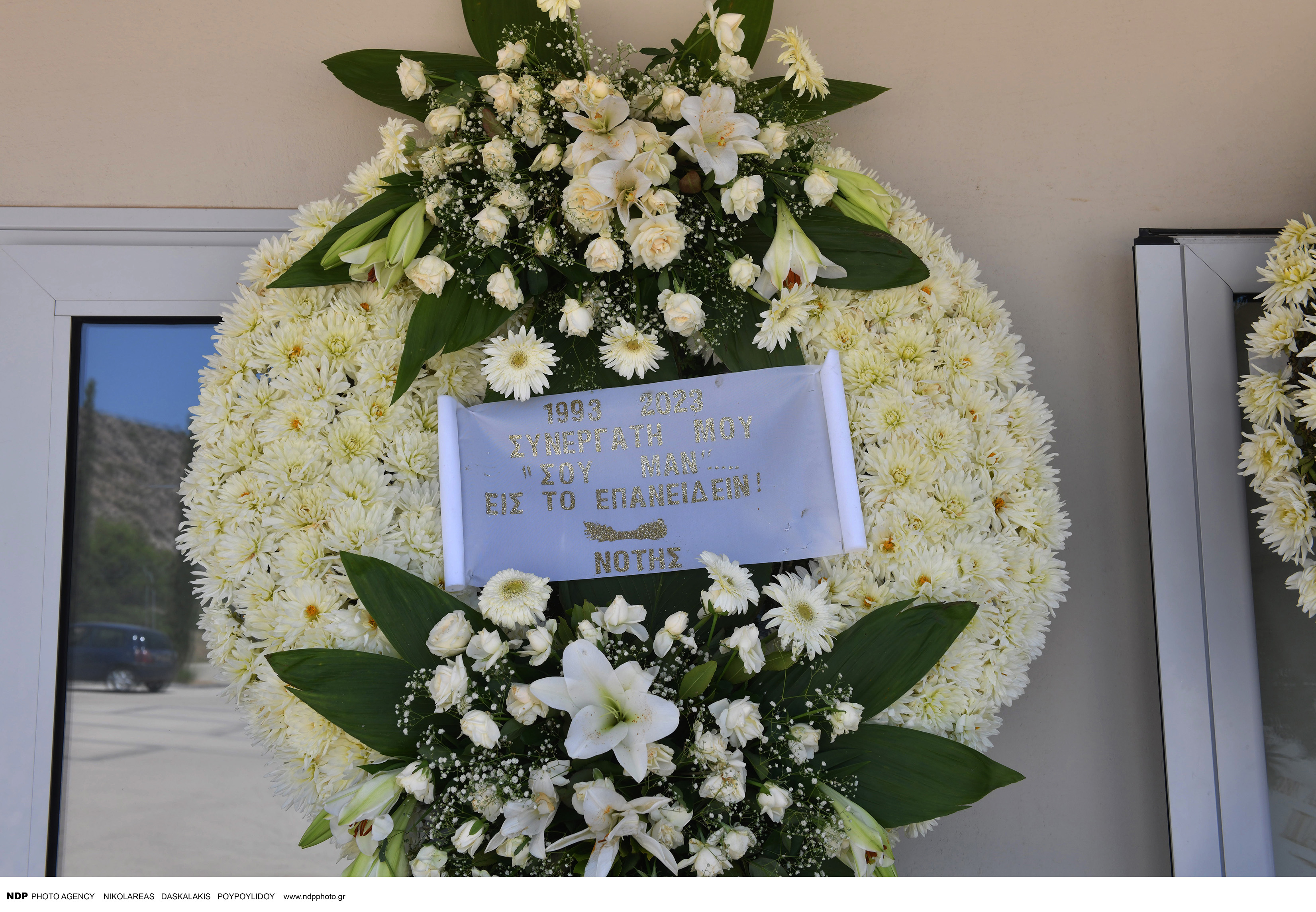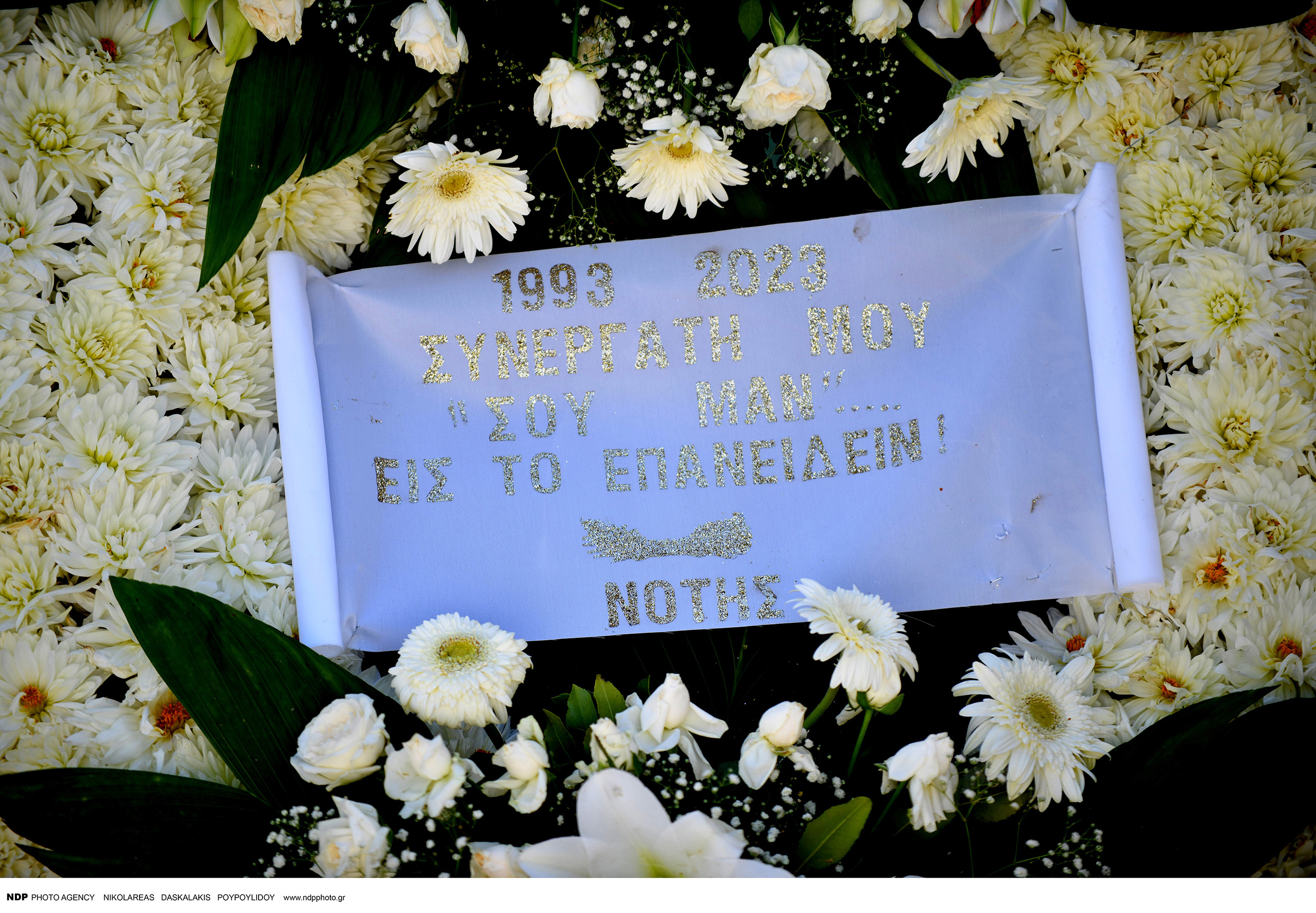 Στο στεφάνι που έστειλε ο λαϊκός τραγουδιστής γράφει με κεφαλαία γράμματα: «Συνεργάτη μου «Σου μαν» εις το επανιδείν. Νότης».