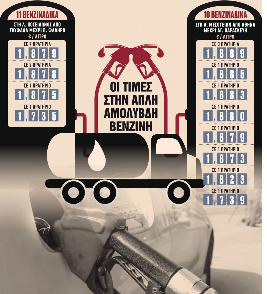 Για παράδειγμα, όπως προκύπτει από τις τιμοληψίες των «ΝΕΩΝ» που βασίστηκαν στις εφαρμογές fuelGR και το fuelprices.gr (Παρατηρητήριο Τιμών Υγρών Καυσίμων του υπ. Ανάπτυξης), αν κάποιος οδηγεί στη Λ. Ποσειδώνος και θελήσει να γεμίσει το ρεζερβουάρ του, όσα χιλιόμετρα κι αν διανύσει θα συναντήσει στην πλειονότητα των πρατηρίων ακριβώς την ίδια τιμή.