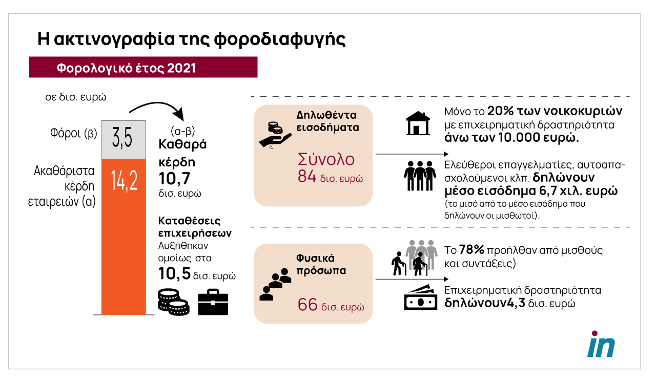 Από τα 84 δισ. ευρώ εισοδημάτων, λοιπόν, που δήλωσαν για το φορολογικό έτος 2021 τα φυσικά πρόσωπα, τα 66 δισ. ευρώ (78%) προήλθαν από μισθούς και συντάξεις. Μόλις τα 4,3 δισ. ευρώ (5%) από επιχειρηματική δραστηριότητα (7% αν συμπεριληφθεί και η αγροτική επιχειρηματική δραστηριότητα). Το 80% των νοικοκυριών που έχουν επιχειρηματική δραστηριότητα δηλώνει εισοδήματα μικρότερα από 10.000 ευρώ. όπως αναφέρει η Eurobank, Σε σύγκριση με την κατανάλωση του 2021, προκύπτει μια διαφορά περίπου 47,8 δις και σε σχέση με την κατανάλωση του 2022, 59,2 δισ. Ευρω.