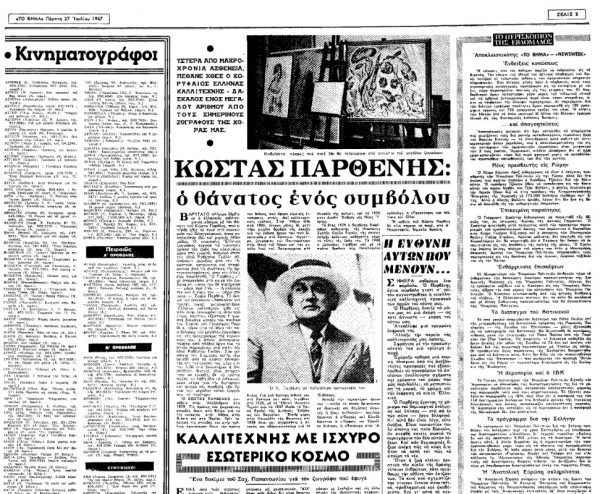Στις 25 Ιουλίου 1967, ημέρα Τρίτη, απεβίωσε ο Κωνσταντίνος Παρθένης, μια από τις σημαντικότερες φυσιογνωμίες της νεοελληνικής τέχνης, κορυφαίος ζωγράφος και δάσκαλος για πολλές γενιές μεταγενέστερων ελλήνων καλλιτεχνών. Ο θάνατός του επήλθε τις πρωινές ώρες στο νοσοκομείο «Ευαγγελισμός», όπου νοσηλευόταν τις τελευταίες εβδομάδες της ζωής του.