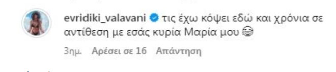 Δεν είχαν όμως όλοι οι followers τη διάθεση για θετικά σχόλια στην ανάρτησή της, με την ίδια να δέχεται ορισμένα κακεντρεχή σχόλια για το σώμα της. Η Ευρυδίκη ωστόσο δεν έμεινε με τα «χέρια σταυρωμένα» και απάντησε κατάλληλα.