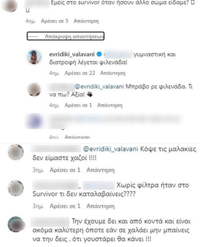 «Εμείς στο survivor όταν ήσουν άλλο σώμα είδαμε;» έγραψε μια follower με την Ευρυδίκη να απαντά: «Γυμναστική και διατροφή λέγεται φιλενάδα!».
