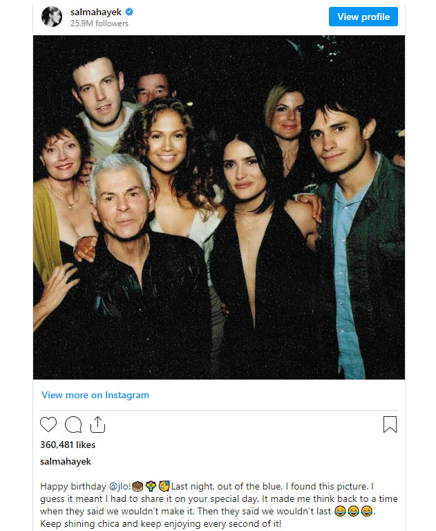 Η Salma Hayek ανέβασε την επομένη των γενεθλίων μία παλιά φωτογραφία της ίδιας μαζί με την εορτάζουσα, την Susan Sarandon, τον Ben Affleck και τον Gael García Bernal, και της ευχήθηκε χρόνια πολλά και διαδικτυακά.