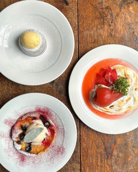 Οι επιλογές για επιδόρπιο αποτελούνται από pavlova φράουλας και λευκής σοκολάτας, τάρτα limoncello και pannacotta γιαουρτιού βατόμουρου.