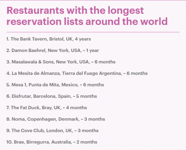 Το Fat Duck στο χωριό Μπρέι έρχεται στην έβδομη θέση με χρόνο αναμονής τεσσάρων μηνών και το Cove Club στο Λονδίνο είναι ένατο χάρη στη λίστα κρατήσεων τριών μηνών.
